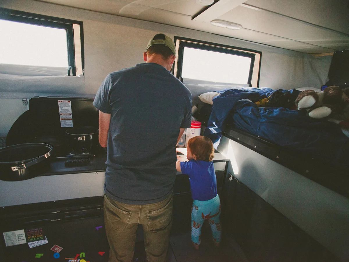 There’s a stove inside, but counter space is tight and floor space is tighter. I cook outside when I can. Fire up the Partner Steel stove and make quick work of whatever I’m into. Do the dishes after while Beth keeps kiddo entertained.