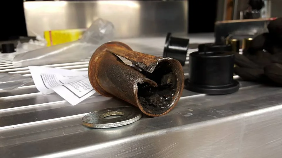 I put this job off because it’s hell. A guaranteed shitfest of writhing around on concrete, tangled in extension cords and air lines, scrambling in a dusting of burnt rubber and metal shavings, hands and tools and coveralls slathered in tacky assembly grease and blood. But, with three of the six bushings torn on the Dodge, they’d all need to be replaced before installing a new camper in California.
