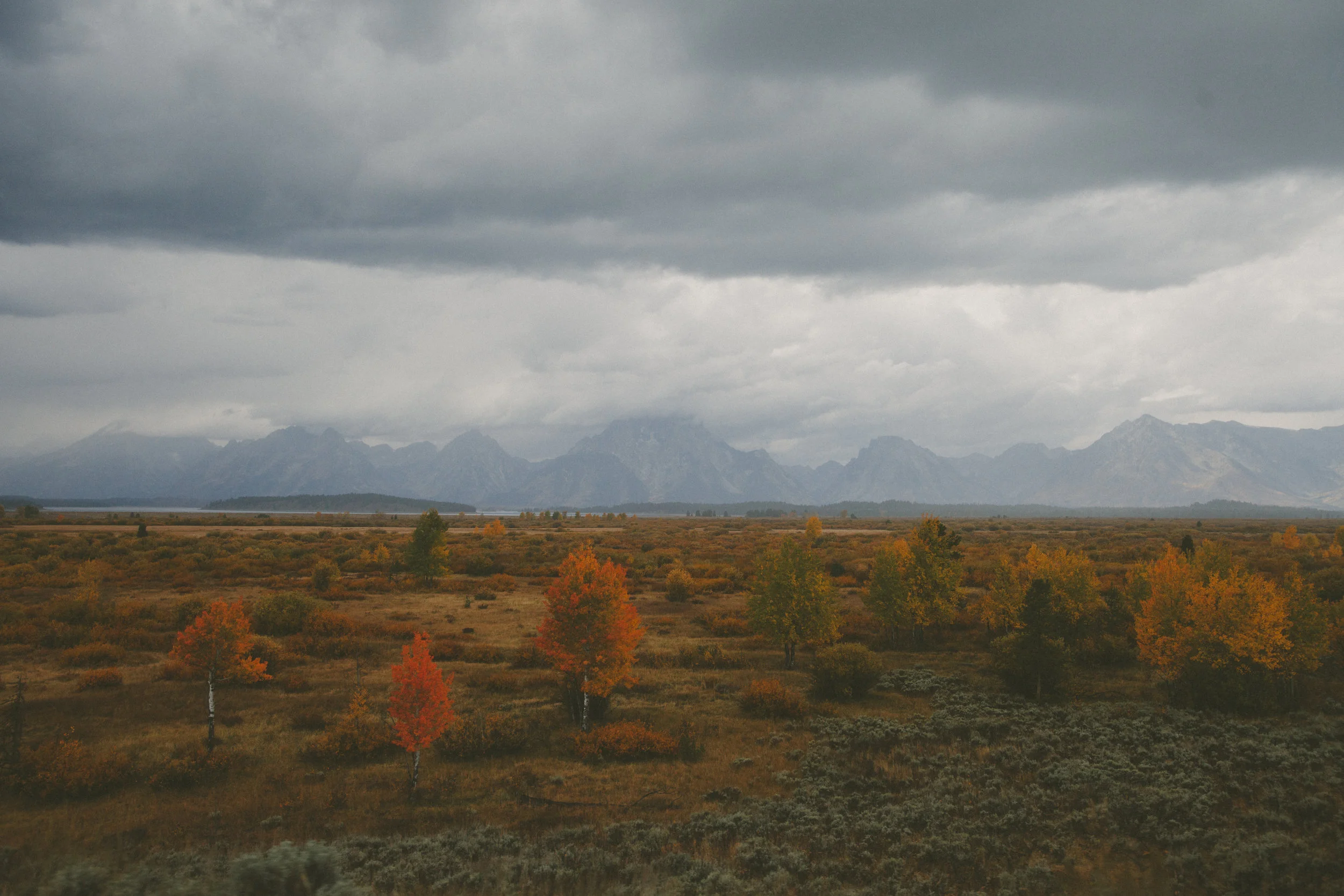 It’s raining as we work our way towards Jackson. The Tetons towering around us, defining our horizons, their saw-tooth peaks already white with snow. The sun streaks through the dark clouds in places, shining on the aspen groves that dot the fields between us and those mountains. Their leaves are lighted with the gold of autumn.