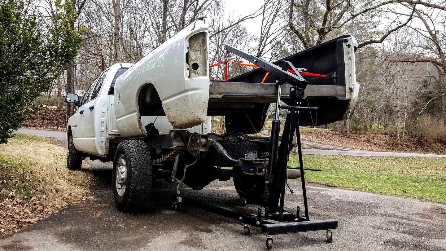 The bed came off this week. It’s the first real step in the truck’s transition from hammered work mule to roaming home. Eight bolts, some wires, and a fuel neck. That’s all it took. I had the thing dangling from a cherry picker inside of an hour. In a few days, I’ll load up and aim the Dodge north, for Pennsylvania, to pick up the aluminum flatbed that’ll serve as the base for our pop-up truck camper.