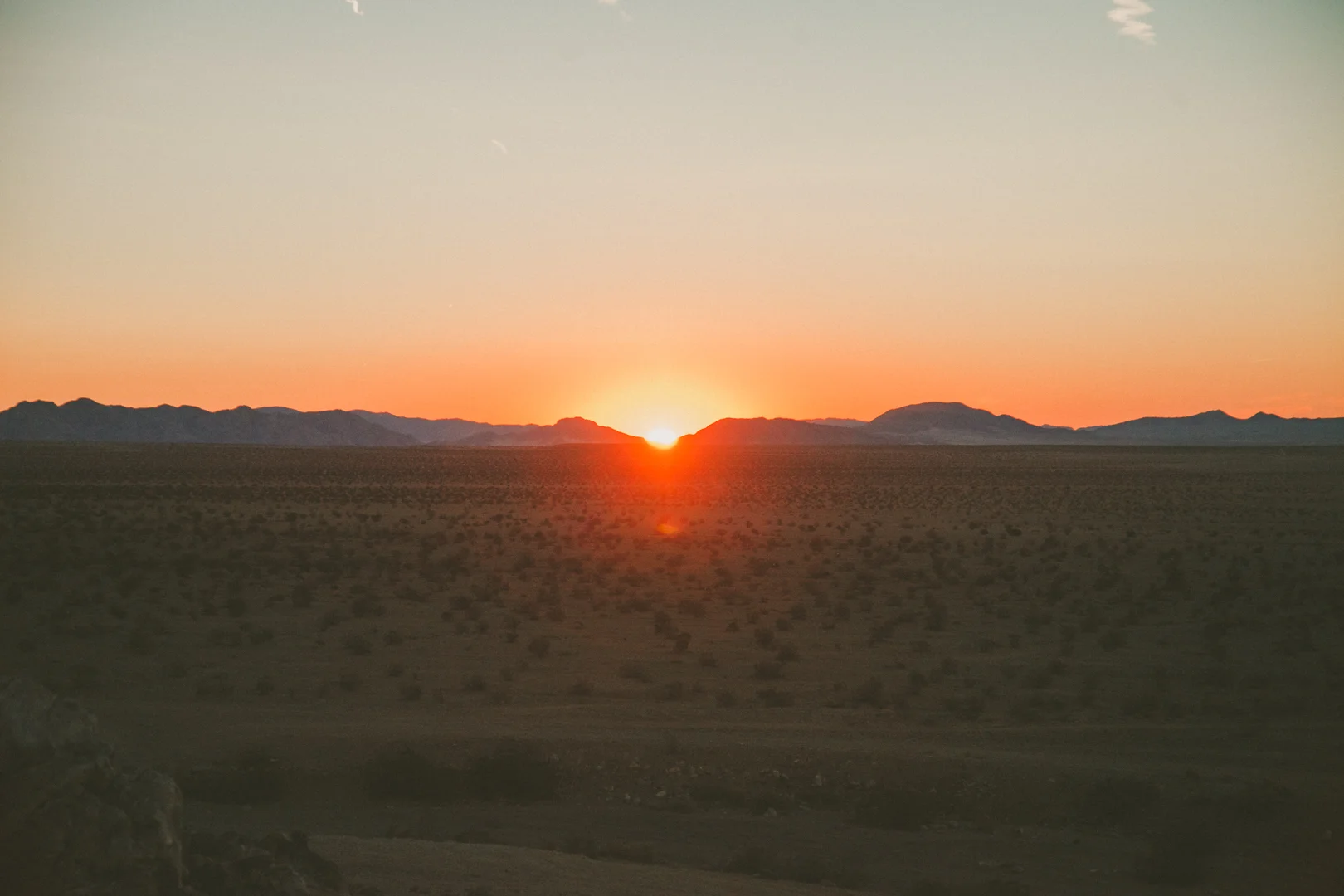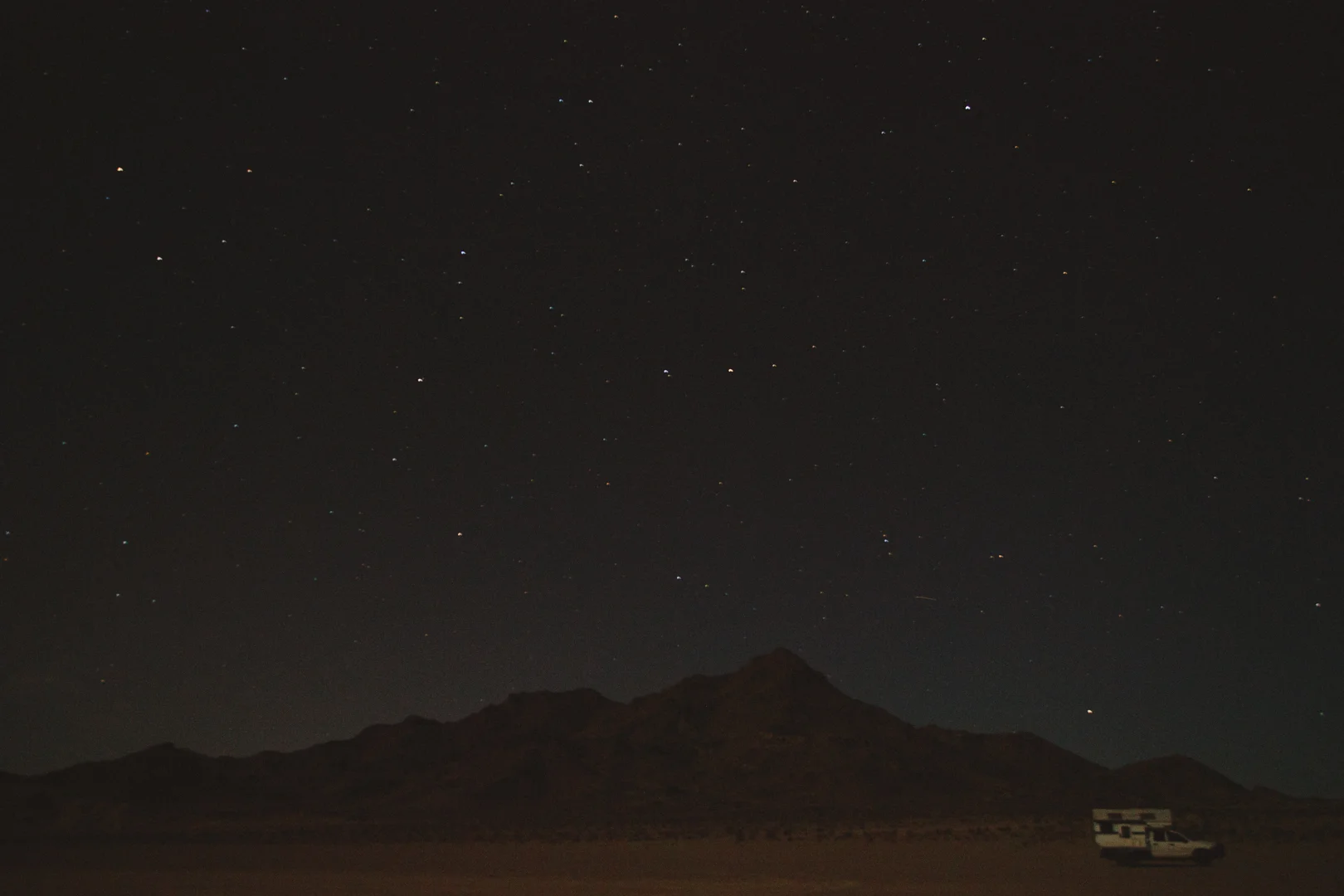 When I reach the top, I have enough time to sit and sip cold coffee out of my only mug. Tiny desert birds flit in and out of the rocks around me, curious at the interloper. The truck is small in the distance, a white smudge on the dim edge of the sprawling dry lake. Headlights flicker on the highway, miles off. The sun is a slow thing. It takes its time, and the first long, red rays won’t touch the sand for another 10 minutes. I fill my lungs with the dry air and wait.